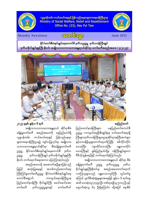 လူမှုဝန်ထမ်း၊ ကယ်ဆယ်ရေးနှင့် ပြန်လည်နေရာချထားရေးဝန်ကြီးဌာန၏ ဇွန်လအတွက် သတင်း...