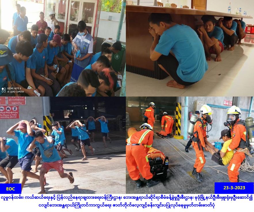 လူမှုဝန်ထမ်း၊ ကယ်ဆယ်ရေးနှင့် ပြန်လည်နေရာချထားရေးဝန်ကြီးဌာန၊ ဘေးအန္တရာယ်ဆိုင်ရာစီမံခန့်ခွဲမှု ဦးစီးဌာန၊ မုဒုံမြို့နယ်ဦးစီးမှူးရုံးမှဦးဆောင်၍ (၂၃-၃-၂၀၂၃)ရက်နေ့၊ (၀၈:၀၀)အချိန်မှ (၀၉:၃၀) နာရီ အချိန်ထိ ငလျင်ဘေးအန္တရာယ်ကြိုတင်ကာကွယ်ရေး ဇာတ်တိုက်လေ့ကျင့်ခြင်းဖြင့် ဆုံးရှုံးမှုလျော့နည်း လာစေရေးနှင့် ခံနိုင်ရည်ရှိသောလူ့အဖွဲ့အစည်းများအဖြစ် ရပ်တည်လာစေရန်ရည်ရွယ်ပြီး မုဒုံမြို့နယ်၊ ကွမ်တာကျေးရွာရှိ ဖူရှင်းဘရားသား(စ်)ခရမ့်ရာဘာစက်ရုံ၌ ပြည်သူလူထု (၁၀၀)ဦးခန့်ဖြင့် ငလျင်ဘေး အန္တရာယ်ကြိုတင်ကာကွယ်ရေး ဇာတ်တိုက်လေ့ကျင့်ခန်းအား ကျင်းပပြုလုပ်ခဲ့ကြောင်း သတင်းရရှိပါသည်။
