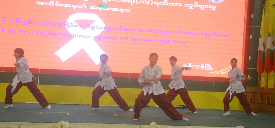 ၂၀၂၅ ခုနှစ်၊ နိုဝင်ဘာလ (၂၇) ရက်နေ့တွင် ကျင်းပပြုလုပ်သည့် “အမျိုးသမီးများအပေါ် အကြမ်းဖက်မှုပပျောက်ရေး (၁၆) ရက်တာလှုပ်ရှားမှု” အထိမ်းအမှတ် အခမ်းအနားအား ရန်ကုန်တိုင်းဒေသကြီး အမျိုးသမီးကော်မတီမှကြီးမှူး၍ (၂၇.၁၁.၂၀၂၅)ရက်နေ့ နံနက် (၀၈:၀၀) နာရီအချိန်တွင် ရန်ကုန်တိုင်းဒေသကြီး အစိုးရအဖွဲ့ရုံး၊ မင်္ဂလာခန်းမ၌ ကျင်းပပြုလုပ်ခဲ့ရာ ရန်ကုန်တိုင်းဒေသကြီး အစိုးရအဖွဲ့၊ ဝန်ကြီးချုပ်၊ ရန်ကုန်တိုင်းဒေသကြီး အမျိုးသမီးကော်မတီ နာယက/ ရန်ကုန်တိုင်းဒေသကြီး အစိုးရအဖွဲ့၊ ဝန်ကြီးချုပ်၏ဇနီး၊ ရန်ကုန်တိုင်းဒေသကြီး အစိုးရအဖွဲ့ တိုင်းမှူး၏ဇနီး၊ ရန်ကုန်တိုင်းဒေသကြီး အစိုးရအဖွဲ့ဝင် ဝန်ကြီးများနှင့် ဇနီးများ၊ တိုင်းဒေသကြီး အမျိုးသမီးကော်မတီဝင်များ၊ ရန်ကုန်တိုင်းဒေသကြီး အမျိုးသမီးရေးရာအဖွဲ့၊ ရန်ကုန် တိုင်းဒေသကြီး မိခင်နှင့်ကလေးစောင့်ရှောက်မှု ကြီးကြပ်ရေးအဖွဲ့၊ မြန်မာနိုင်ငံအမျိုးသမီးနှင့် ကလေးသူငယ်များဘဝမြှင့်တင်ရေးအသင်းမှ တာဝန်ရှိသူများ၊ အမျိုးသမီးအရေးဆောင်ရွက်နေသည့် အဖွဲ့အစည်းများ၊ ခရိုင်အုပ်ချုပ်ရေးမှူးများနှင့်ဇနီးများ၊ ဖျော်ဖြေရေးအဖွဲ့များ စုစုပေါင်း (၃၅၀)ဦး တက်ရောက်ခဲ့ကြ ပါသည်။