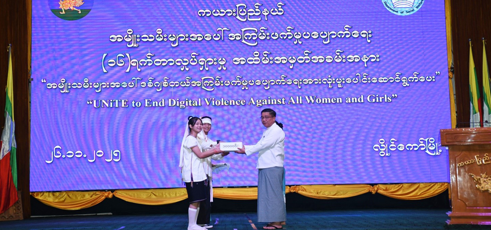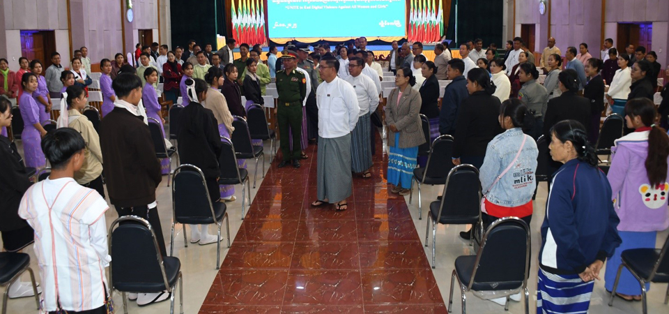 အမျိုးသမီးများအပေါ် အကြမ်းဖက်မှုပပျောက်ရေး (၁၆)ရက်တာလှုပ်ရှားမှု အထိမ်းအမှတ်အခမ်းအနားကို (၂၆-၁၁-၂၀၂၅)ရက်နေ့၊ နံနက်(၀၈:၃၀) နာရီအချိန်၊ ကယားပြည်နယ်၊ ပြည်နယ်ခန်းမ၌ ကျင်းပပြုလုပ်ခဲ့ရာ ကယားပြည်နယ်အစိုးရအဖွဲ့၊ ပြည်နယ်ဝန်ကြီးချုပ် ဦးဇော်မျိုးတင် တက်ရောက်၍ အဖွင့်အမှာစကား ပြောကြားခဲ့ပါသည်။ ကယားပြည်နယ်အစိုးရ အဖွဲ့မှအခမ်းအနားတွင် ကပြဖျော်ဖြေပေးသွားသည့် အကအဖွဲ့(၃)ဖွဲ့အား တစ်ဖွဲ့လျှင် ဂုဏ်ပြုဆု ငွေကျပ်၁၀၀၀၀ဝိ/ -တိတိ (တစ်သိန်းကျပ်တိတိ)စီ ချီးမြှင့်ပေးအပ်ခဲ့ပါသည်။ အခမ်းအနားအား နံနက်(၁၀:၀၀)နာရီ အချိန်တွင် ကျင်းပပြီးစီးခဲ့ပါသည်။
