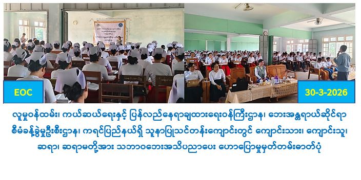 လူမှုဝန်ထမ်း၊ ကယ်ဆယ်ရေးနှင့် ပြန်လည်နေရာချထားရေးဝန်ကြီးဌာနအနေဖြင့် မိမိတို့ နေအိမ်များတွင် နေထိုင်ရန် ခက်ခဲပြီးအပူဒဏ်တိမ်းရှောင်ရန် လိုအပ်သူများအတွက် အပူရှောင် စခန်းများအားမကွေးမြို့နယ်၊ ရေနံချောင်းမြို့နယ်၊ ချောက်မြို့နယ်နှင့် နတ်မောက်မြို့နယ်များတွင် (၁၆-၃-၂၀၂၆) ရက်နေ့မှ စတင်ဖွင့်လှစ်ပေးထားပြီးအပူရှောင်လာရောက်သူများအားသဘာဝဘေးအန္တရာယ်နှင့်စပ်လျဉ်း၍ အသိပညာပေးဟောပြောခြင်း၊ လက်ကမ်းစာစောင်များဖြန့်ဝေခြင်း၊ အပူဒဏ်ကာကွယ်နိုင်ရေးဆောင်ရန်/ ရှောင်ရန်များအားကျယ်ကျယ်ပြန့်ပြန့်အသိပညာပေးခြင်းများဆောင်ရွက်ပေးလျက်ရှိပါသည်။
